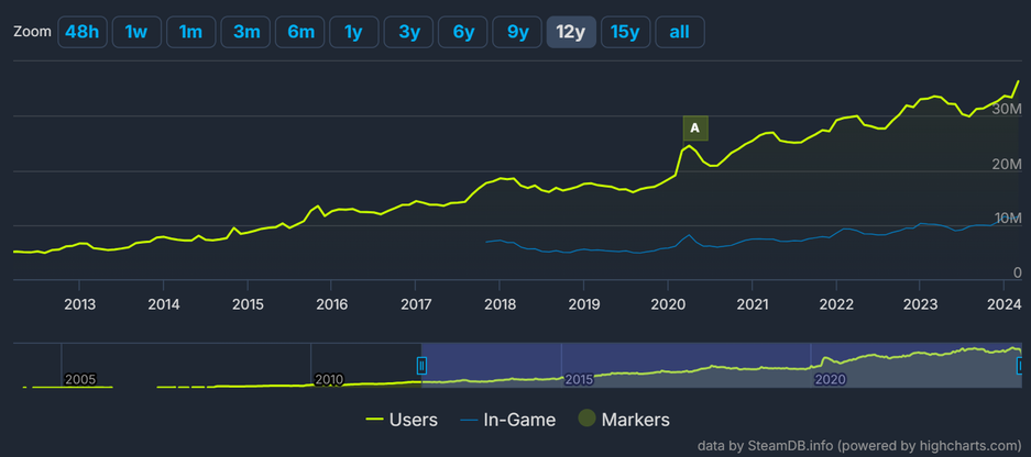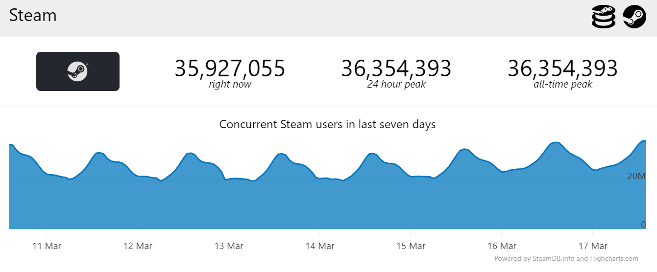10 марта 2024 года онлайн в Steam пробил отметку в 35 миллионов, а 17 марта продолжил победную серию — сервис SteamDB зарегистрировал пиковый онлайн 36 354 393, на момент установления рекорда более 11.5 миллиона пользователей находились в какой-нибудь игре.