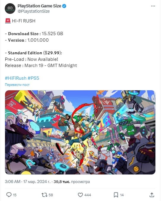 Как сообщает аккаунт PlayStation Game Size X, установочный файл Hi-Fi Rush весит 15,525 ГБ. Это значительно меньше, чем размер игры на Xbox Series X|S.