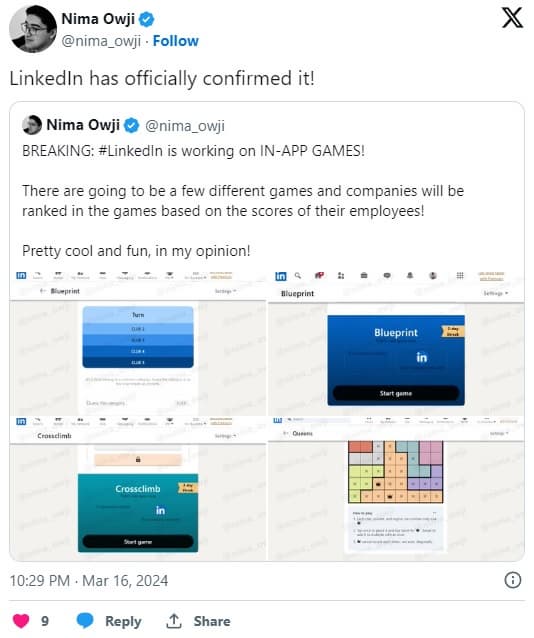 И хотя сейчас эта тема не настолько актуальна, как несколько лет назад, похоже, LinkedIn планирует предпринять интересные шаги. Как сообщил разработчик Нима Оуджи в Twitter, в настоящее время корпорация работает над играми, которые будут доступны в приложении платформы. Для начала это будут простые продукты, основанные на принципах, знакомых по некогда знаменитой Wordle.