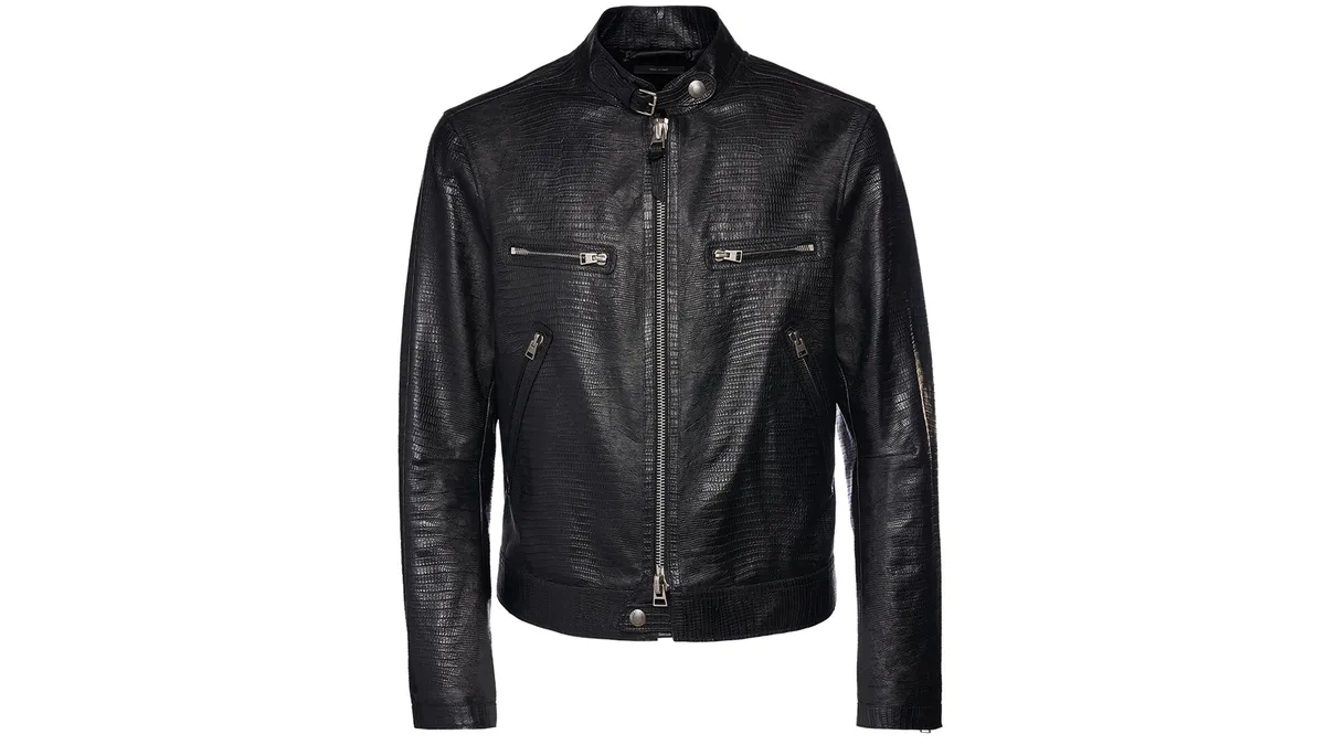 После экспресс-расследования по открытым данным удалось идентифицировать новенькую куртку — это часть весенней коллекции 2024 года дизайнера Тома Форда (Tom Ford), изготовлена из телячьей кожи.