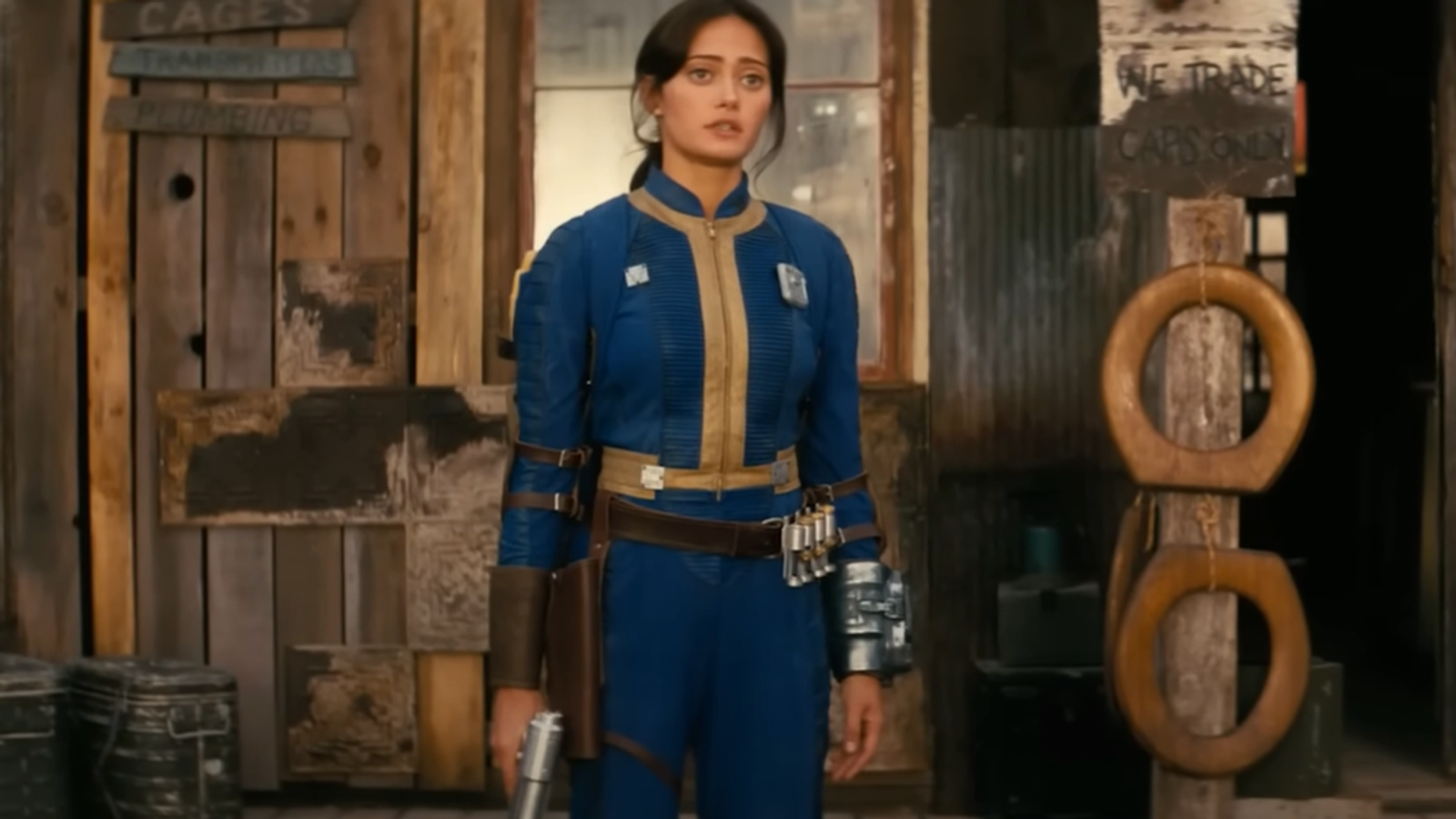 В сети продолжают публиковать кадры сериала Fallout от Amazon. На этот раз показали небольшой конфликт между гулем-охотников и девушкой (оба протагонисты).