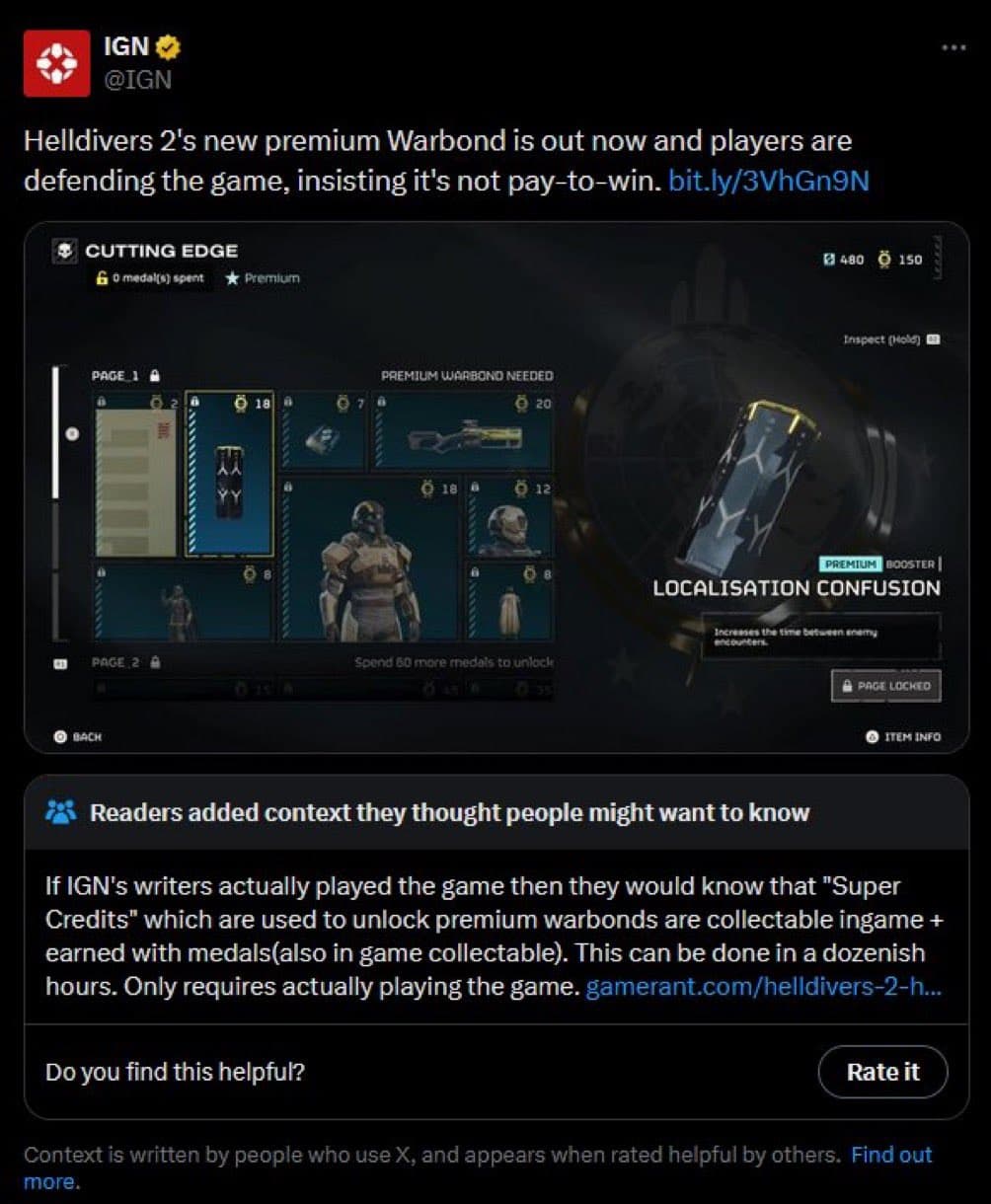 Фанаты шутера категорически не согласились с данным заявлением и поспешили отметить, что если бы кто-то в редакции IGN действительно играл в Helldivers 2, то он бы знал, что супер-кредиты на покупку варбонда можно найти в ходе выполнения миссий, а снаряжение из варбонда можно лишь обменять на медали, которые даются за успешное выполнение заданий.