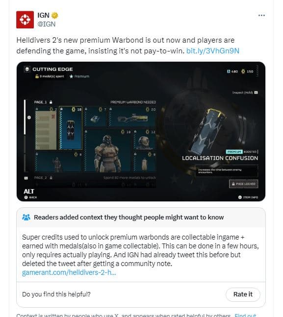 Портал IGN пытался создать волну негатива в адрес Helldivers 2, обвинив игру в том, что игроки могут приобрести дающие преимущество в миссиях оружие и экипировку за реальные деньги, приобретя варбонд.