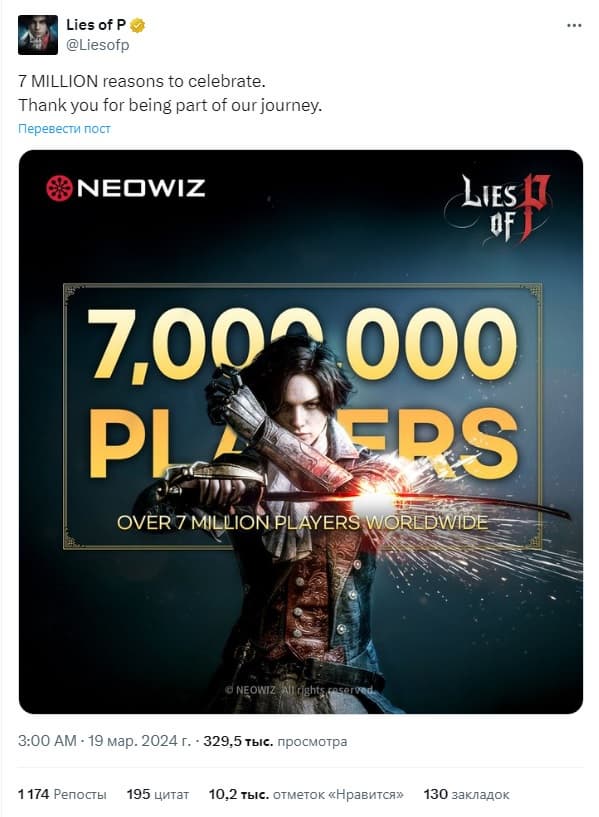 Компания Neowiz подтвердила, что игра студии Round8, достигла большого успеха. Lies of P попробовали более 7 миллионов человек.
