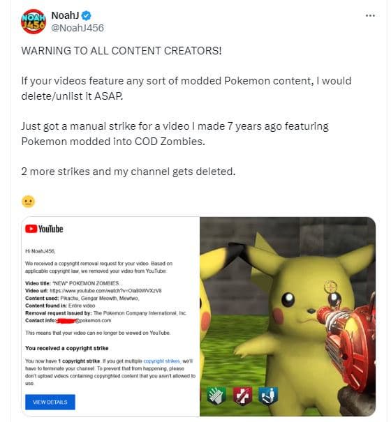 Блогер NoahJ456 получил страйк на свое видео 7-летней давности. На кадрах он играет в зомби-режим Call of Duty, в котором живые мертвецы были заменены на покемонов.