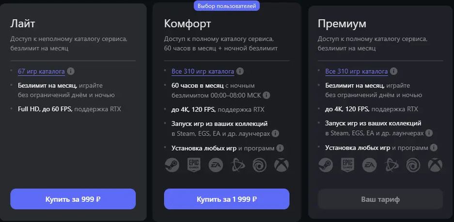В тариф «Комфорт» входят 60 часов игры в месяц + ночной безлимит; тариф «Премиум» позволяет использовать возможности VK Play Cloud без ограничений.