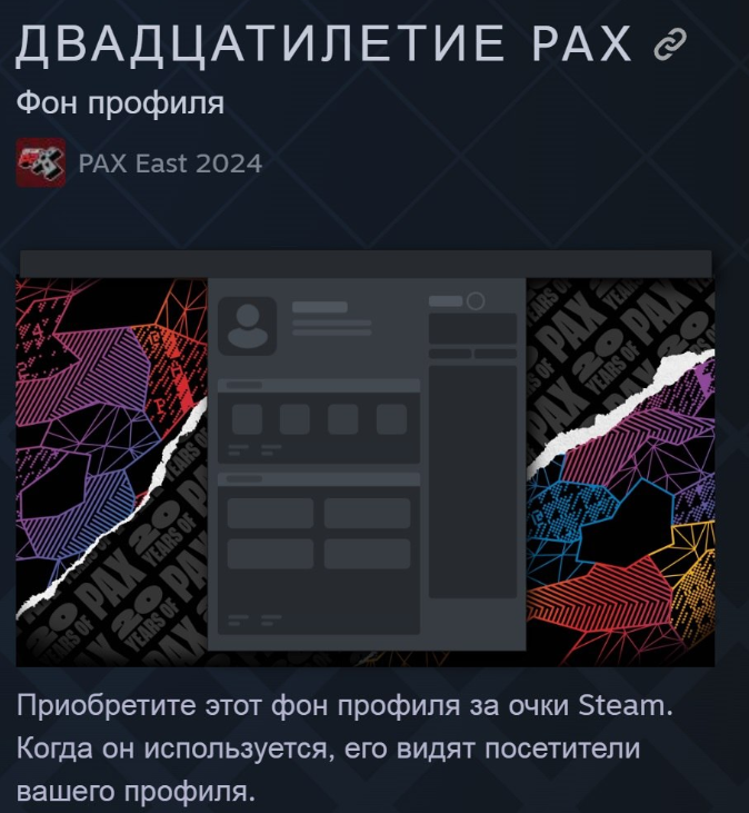 В 2024 году выставка PAX East празднует юбилей: в честь 20-летия устроили раздачу фона в Steam. Получить подарок можно в магазине «Предметы за очки»: https://store.steampowered.com/points/shop/app/1253250