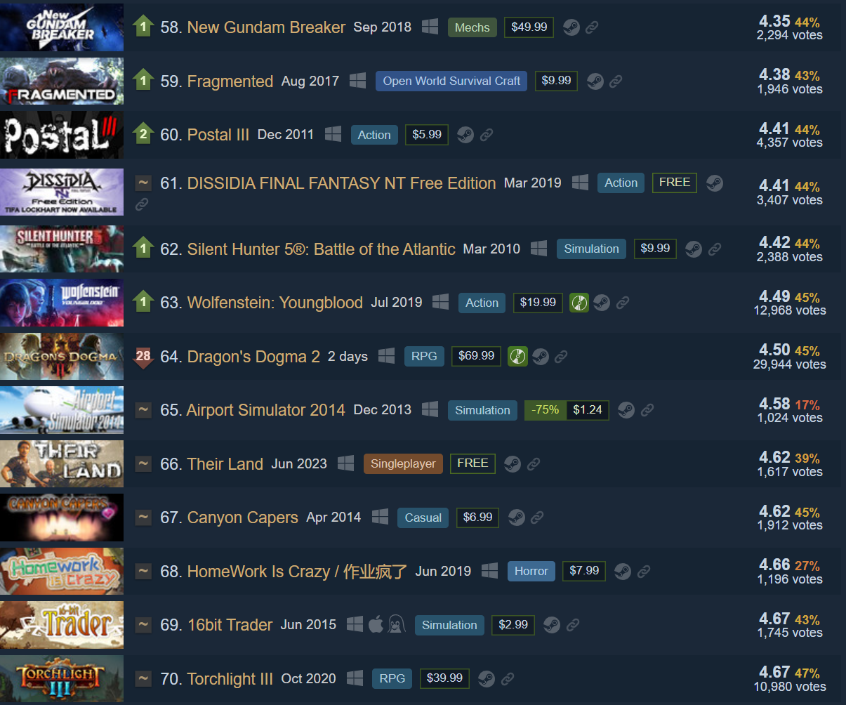 Со временем некоторые распробовали саму Dragon's Dogma 2, поэтому рейтинг в Steam подрос до уровня «Смешанные» и игра поднялась в списке худших на 64 место, т.е. до уровня Wolfenstein Youngblood.