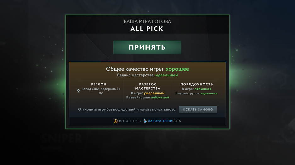 «В экспериментальных рамках новой программы "Лаборатории Dota" (и пока что только для подписчиков Dota Plus) мы выпускаем первую версию функции, о которой игроки просили нас уже давно: теперь Dota Plus показывает такую информацию о только что найденной игре, как примерный разброс мастерства и порядочность игроков. У вас будет возможность как принять игру, так и начать поиск заново, чтобы дождаться более подходящих условий.