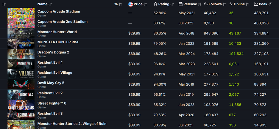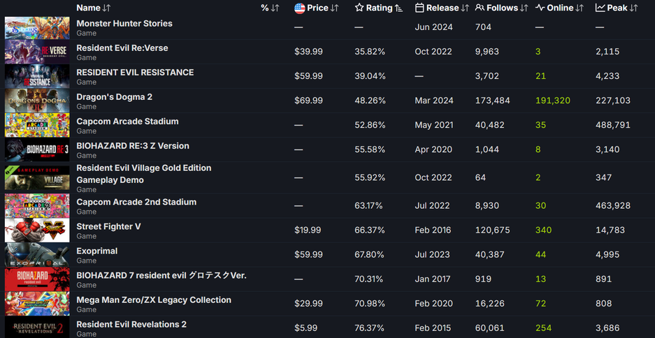 По данным SteamDB, у Dragon's Dogma 2 худший рейтинг среди одиночных игр Capcom — хуже лишь пара мультиплеерных продуктов Resident Evil Re:Verse и Resident Evil Resistance