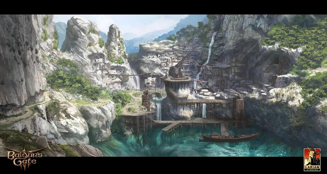 Также представили одну из вырезанных локаций. Оказывается, в определённый момент предполагалось, что игроки в Baldur's Gate 3 смогут исследовать деревню гномов (Gnome Village). Однако в итоге от данной идеи решили отказаться. В наличии остался следующий арт.