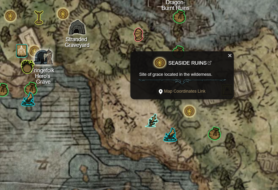 Sekiro Dubi предположил, что изначально стартовая локация была иной. Он изучил версию с сетевого теста Elden Ring и пришёл к выводу, что изначально игроки появлялись после первой смерти на пляже в районе Seaside Ruins. Это выглядит гораздо логичнее: Мелина и Торрент нашли бы героя лежащим на пляже — персонаж с первой локации падает куда-то вниз, т.е. он мог бы улететь в воду и его затем выбросило на берег. От этого пляжа игрок впоследствии добирался до Stranded Graveyard.