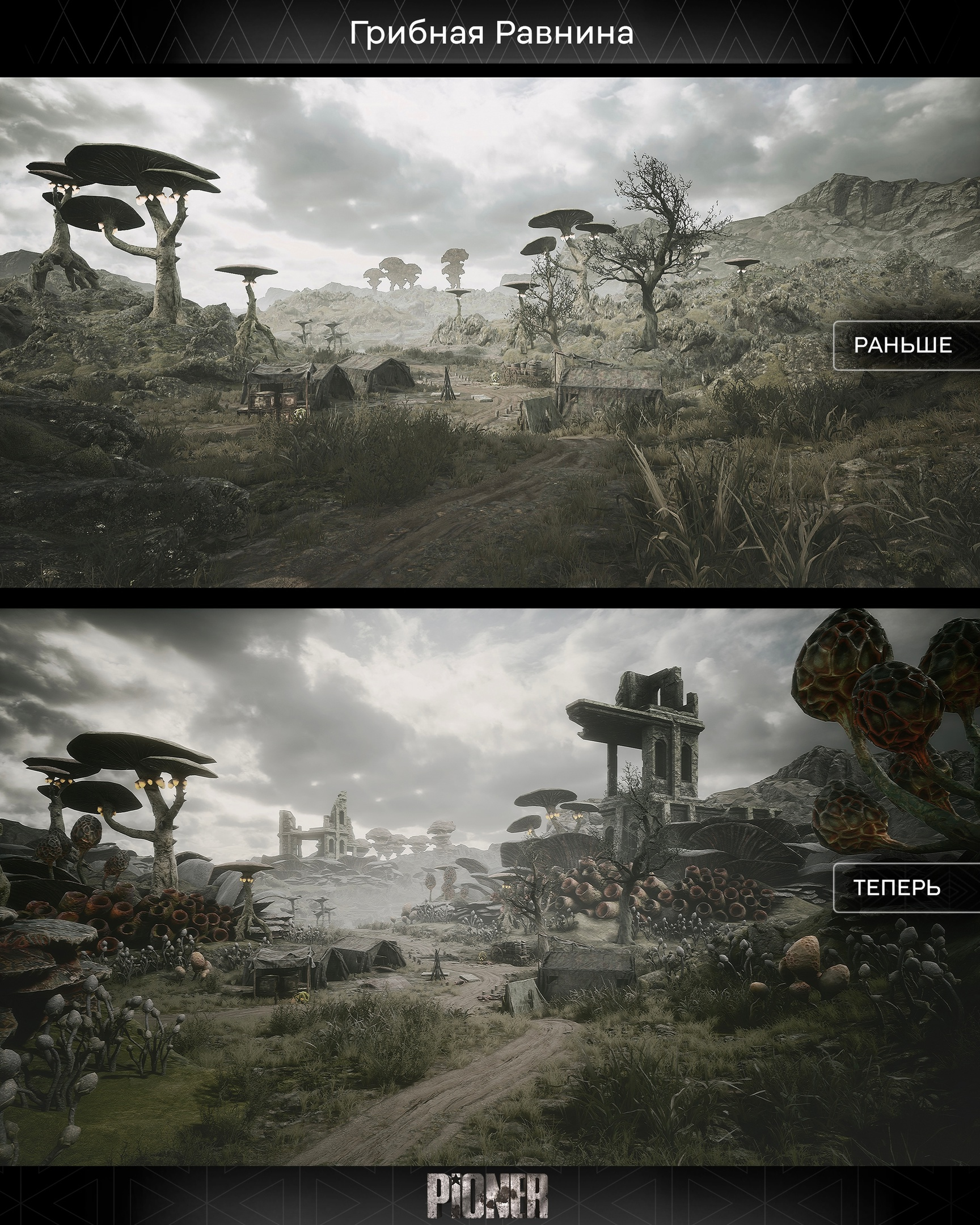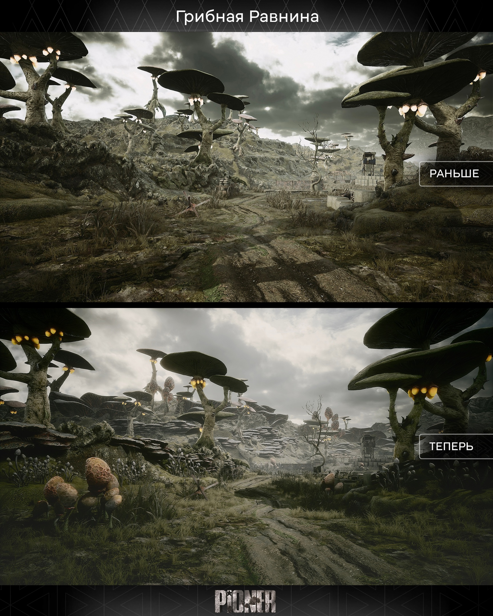 Иногда команда PIONER показывает текущие наработки и сравнивает прошлые версии моделей с актуальными. На этот раз решили вернуться к локации «Грибная Равнина». Так сложилось, что не ней было маловатого самого главного — грибов, этот момент разработчики решили исправить и представили сообществу получившийся результат: