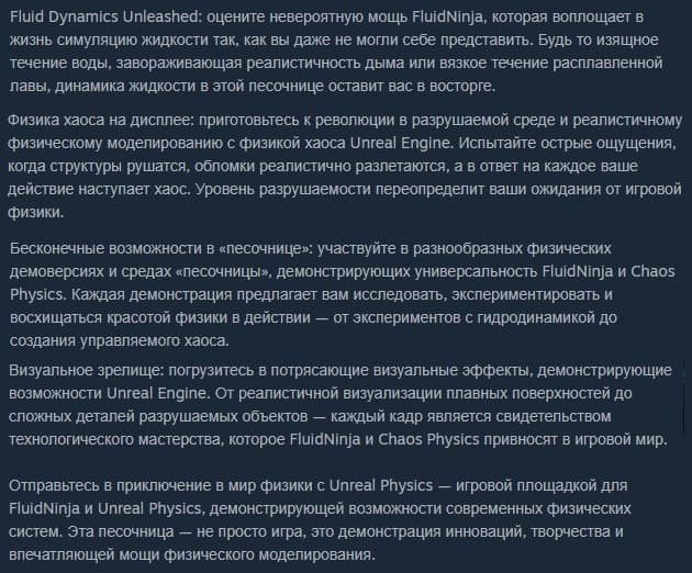 В ней можно оценить передовые графические эффекты Unreal Engine, такие как динамические жидкости, симуляция распространения дыма и разрушаемое окружение.