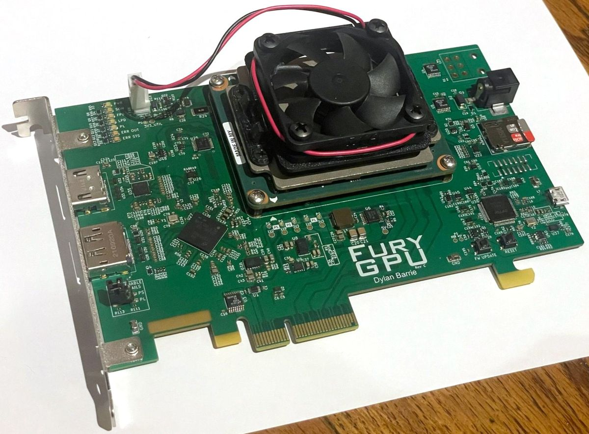 Проект инженера «FuryGpu» основан на Xilinx FPGA (программируемая вентильная матрица). По сути, это чип, который можно запрограммировать для определённых задач. Для реализации задуманного Дилану пришлось изучить язык описания и верификации аппаратуры SystemVerilog, а также программный пакет KiCAD EDA/CAD.
