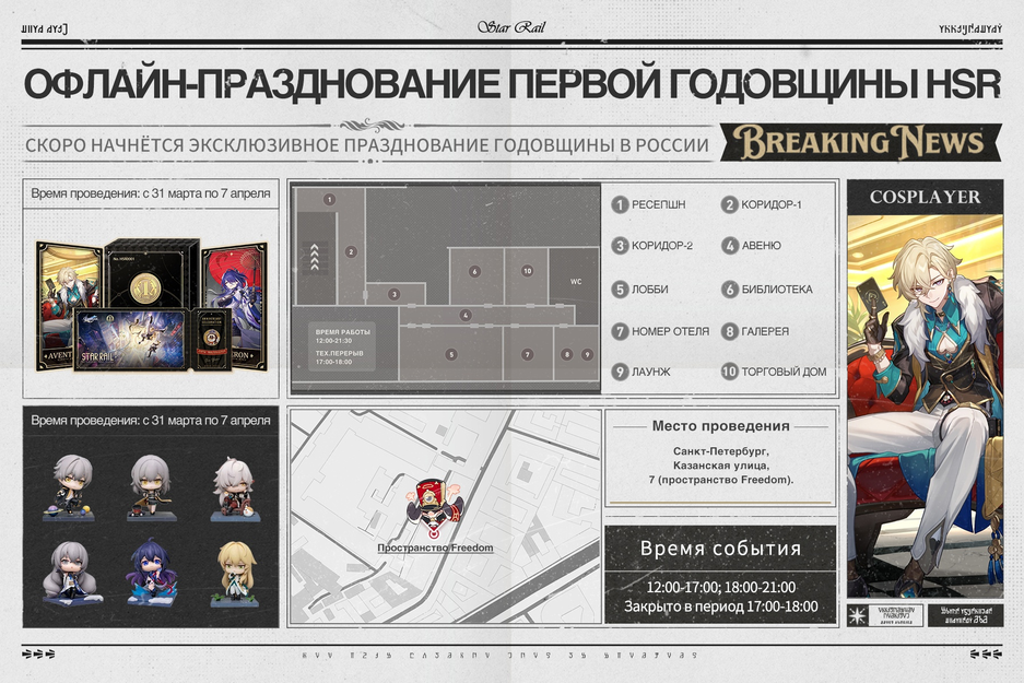 Фестиваль Honkai Star Rail в стиле Пенаконии будет проходить по адресу: Санкт-Петербург, Казанская улица, 7 (пространство Freedom). Время проведения: с 31 марта по 7 апреля 2024 года.