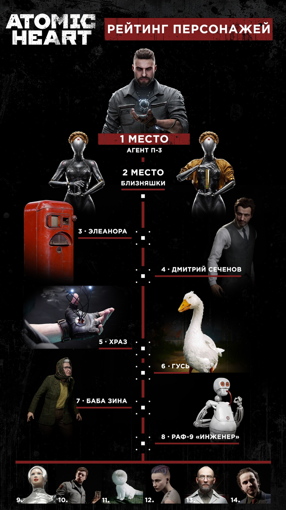 Других персонажей Atomic Heart из основной игры, вроде бабы Зины или робота РАФ-9 «Инженер» потеснил яркий Гусь, покоривший сердца игроков, которые познакомились с дополнением Annihilation Instinct (или «Инстинкт Истребления»). Лариса оказалась на 12 месте.