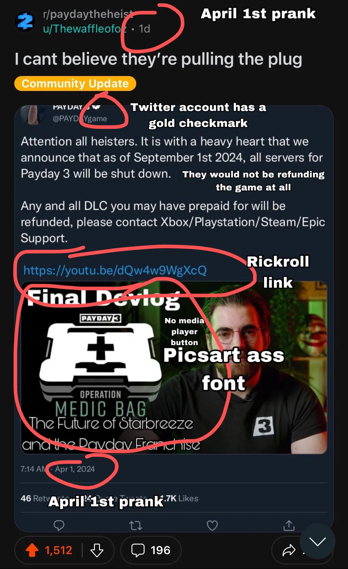 Thewaffleofoz пришлось выпустить пост-опровержение, с разбором своей шуточной публикации. Оказалось, что недовольные ситуацией с Payday 3 пошли заваливать поддержку Starbreeze жалобами — они искренне думали, что серверы игры действительно скоро будут закрыты.