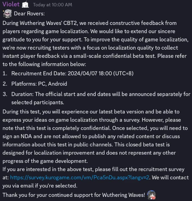 Создатели Wuthering Waves получили «конструктивные отзывы» от игроков о качества локализации. Они приняли решение повысить её качество, для этого необходимы дополнительные участники на тест, которые сфокусируются на вопросах локализации.