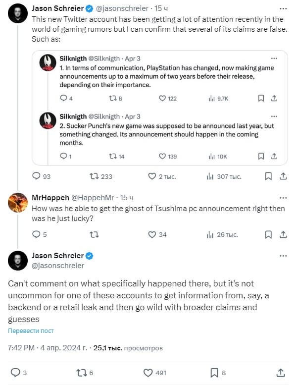 По этому поводу высказался журналист Джейсон Шрейер, который регулярно делится закулисной информацией из мира игр. Редактор Bloomberg дал понять, что Silknight передает некоторые сообщения, которые не соответствуют действительности. Среди примеров он указал на информацию о деятельности PlayStation и новой игре Sucker Punch, который связывали с Ghost of Tsushima 2.