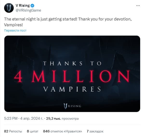 Оказывается, достигнут впечатляющий рубеж – продано более четырех миллионов копий вампирского выживания. Интерес также связан с высокими оценками – 88% в Steam из почти 70 000 отзывов.