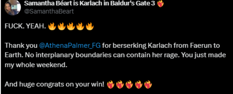 Босс Larian Свен Винке увидел и остался очень доволен; актриса Саманта Беар, исполнявшая роль игровой Карлах, тоже в восторге от такого внезапного появления героини на сцене.