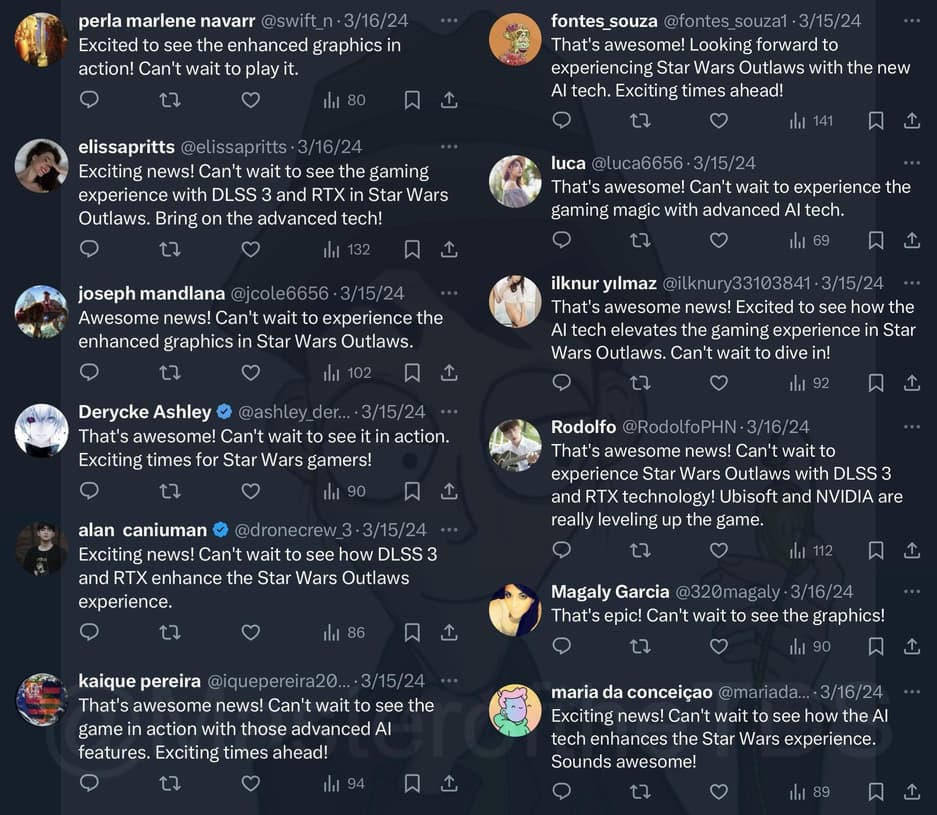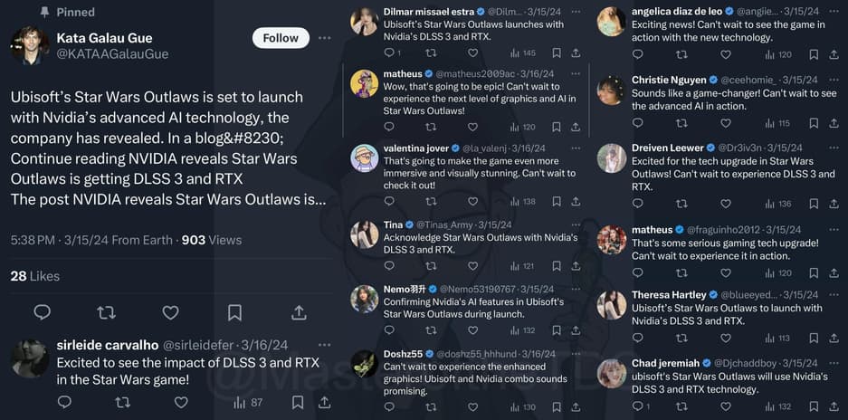 Специализирующийся на социальных сетях аналитик MasteroftheTDS обнаружил, что Disney и Lucasfilm в преддверии премьеры нового трейлера Star Wars Outlaws задействовали ботов, которые в один голос начали нахваливать технологии NVIDIA для улучшения графики, используемые в игре.