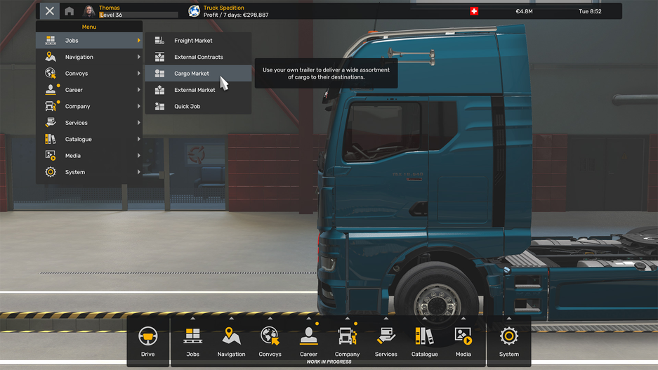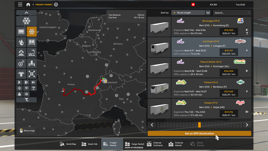 Теперь аналогичное обновление SCS Software выпустила для Euro Truck Simulator 2. Здесь тоже переработали интерфейс — теперь он выполнен в минималистичном стиле, а строка статусов на главном экране переместилась в верхнюю часть. Также представили «скрип» тормозов (звук).