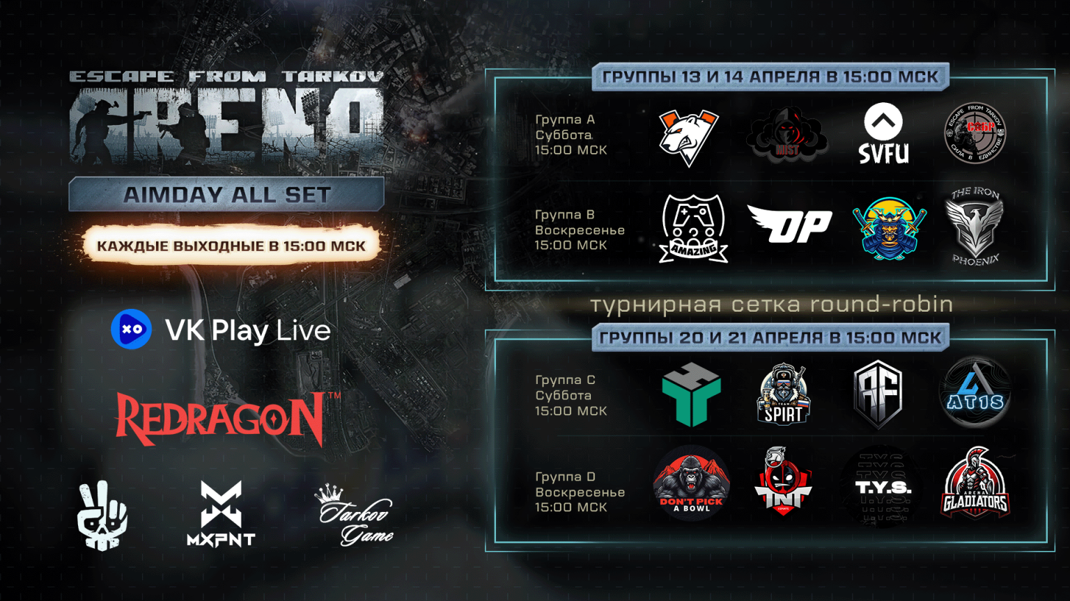 Ожидается, что с 13 по 28 апреля 2024 года будет проходить онлайн-турнир Aimday All Set по Escape from Tarkov Arena. В лиге профессионалов сойдутся 16 коллективов: среди них представлена небезызвестная киберспортивная организация Virtus.pro.