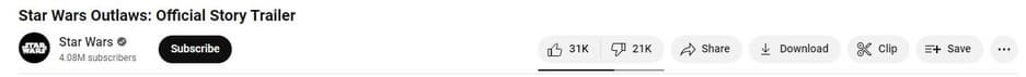 У нового сюжетного трейлера Star Wars Outlaws на момент написания этих строчек свыше 31 тысячи пальцев вверх и почти 21 тысяча пальцев вниз. Количество шуток и негативных комментариев под видео также постоянно растет. Причиной негодования сообщества является ценник в 130 долларов за ультимативное издание и то, что владельцы более дорогих изданий будут играть на три дня раньше остальных.