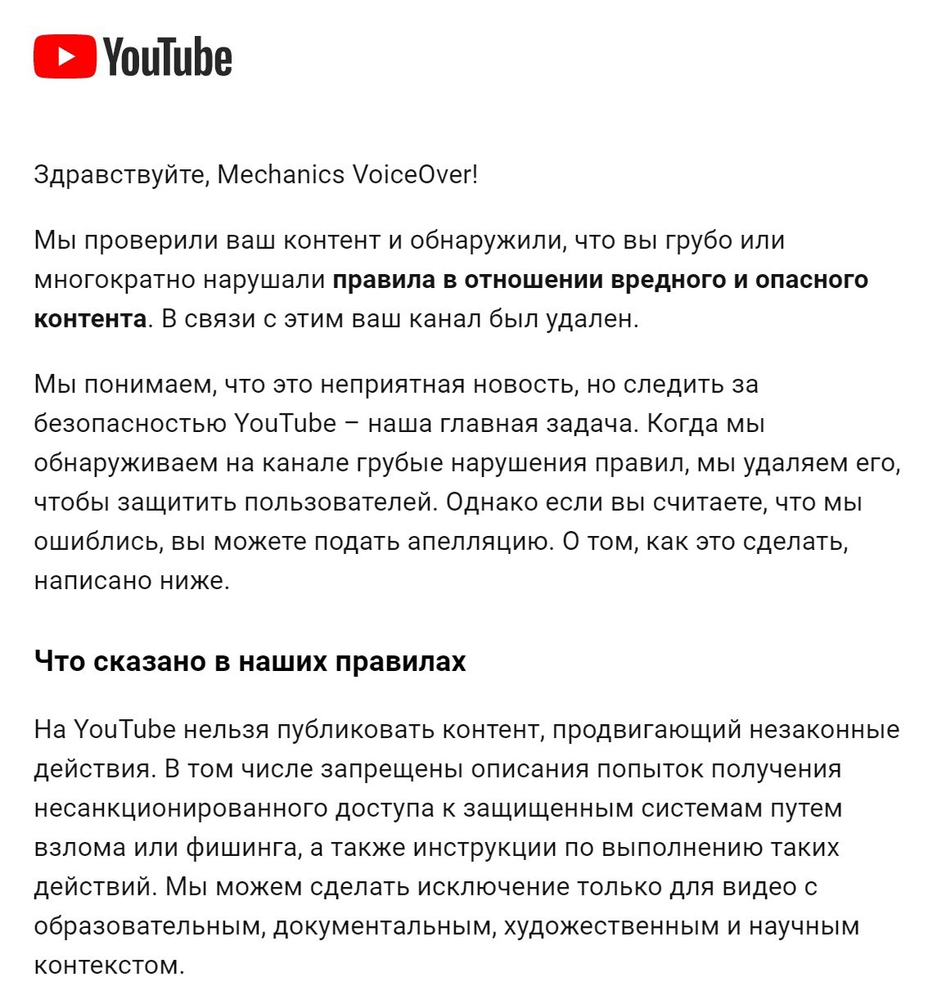 Приключения Mechanics VoiceOver (R.G. MVO) на просторах YouTube внезапно оборвались. Распространять информацию о русской озвучке стало чуть сложнее