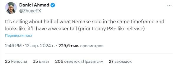 В Twitter появилась версия аналитика Дэниэля Ахмада. По его словам, Final Fantasy 7 Rebirth продалась бы примерно вдвое меньшим тиражом, чем Final Fantasy VII Remake за тот же период времени. Также, по мнению аналитика, жизненный цикл второй части будет гораздо короче, чем у предшественницы, а значит, игра появится в сервисах подписки PlayStation раньше, чем ожидалось.
