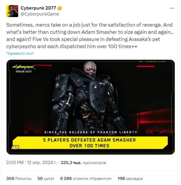По крайней мере, об этом свидетельствует интересный пост, опубликованный разработчиками. Они сообщили, что пять игроков сразились с Адамом Смэшером более ста раз. Более того, речь идет о данных, полученных с момента выхода Cyberpunk 2077: Phantom Liberty.