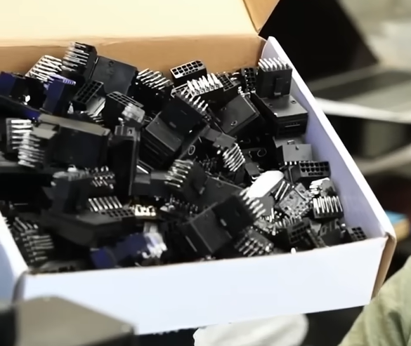 Для подтверждения своих слов автор ролика показал целую коробку с неработающими коннекторами питания от этих пострадавших видеокарт.