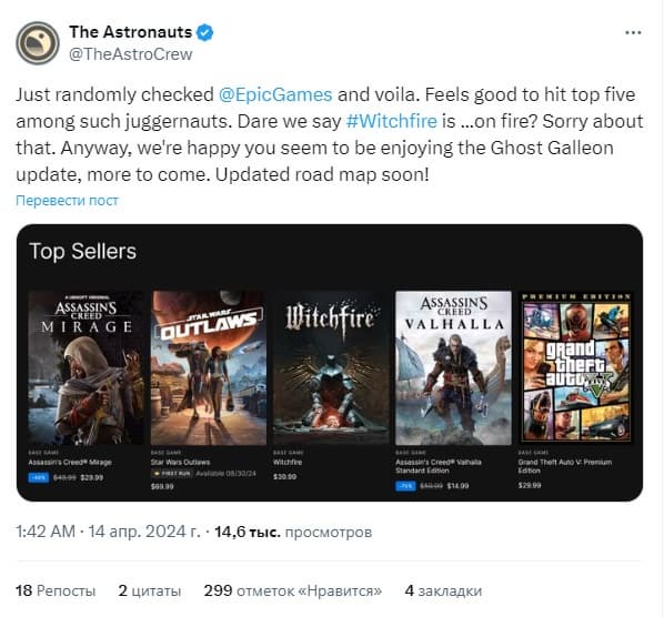 С момента сентябрьского релиза прошло немало времени, и игра недавно получила крупное контентное обновление Ghost Galleon. Оказывается, оно способствовало большому скачку популярности мрачного шутера: на данный момент Witchfire входит в тройку самых продаваемых игр в Epic Games Store, уступив лишь бессмертной Assassin's Creed: Mirage и предзаказам на Star Wars Outlaws. Это огромный успех для разработчиков.