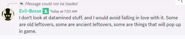 Один из разработчиков студии порекомендовал фанатам игры в Discord не «влюбляться» в добытый датамайнерами контент, ведь какая-то часть файлов осталось в игре еще с разных этапов разработки и от идеи его доделывать в студии уже отказались, когда другие наработки, если и появятся в игре, то позже.