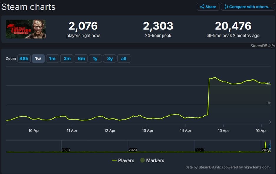 Вероятно, интерес к игре возрос из-за предстоящего релиза (22 апреля 2024 года) Dead Island 2 в Steam. Количество игроков, одновременно проводящих время в Dead Island: Riptide, резко возросло с 300-500 до примерно 2000.