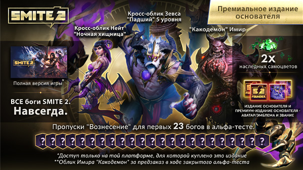 Этот «сиквел» тоже будет условно-бесплатным, но пока предлагают закупиться наборами основателей и поучаствовать в альфа-тестировании. За предзаказ в ходе закрытой альфы подарят облик «Какодемон» для Имира. За потраченную премиальную валюту в первой игре начислят бонусную в SMITE 2, она конвертируется по курсу: за 1 потраченный самоцвет начисляют 2 в новой игре.