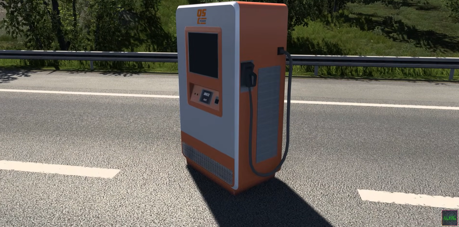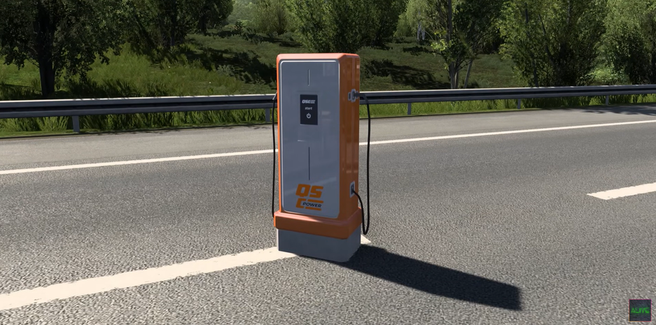 Например, представленная на скриншоте ниже станция в базе игры называется «truck charge», т.е. это зарядка для полностью электрических грузовых автомобилей. Она небольшая, сравнима по размеру с обычной топливной колонкой. Предполагается, что это будет нечто вроде «небольшой подзарядки».