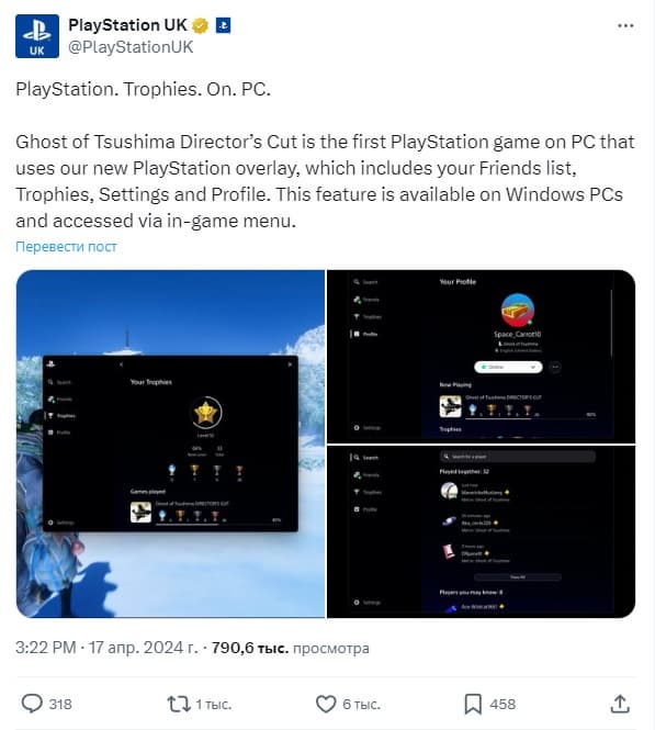 Отличительная особенность ПК-версии Ghost of Tsushima от других игр Sony станет новая функция со специальным оверлеем, который содержит профиль PlayStation, друзей и трофеи. Последний элемент всегда был уникален для консолей японского производителя. Добавление опции для ПК не радует некоторых геймеров, которые открыто критикуют решение Sony.