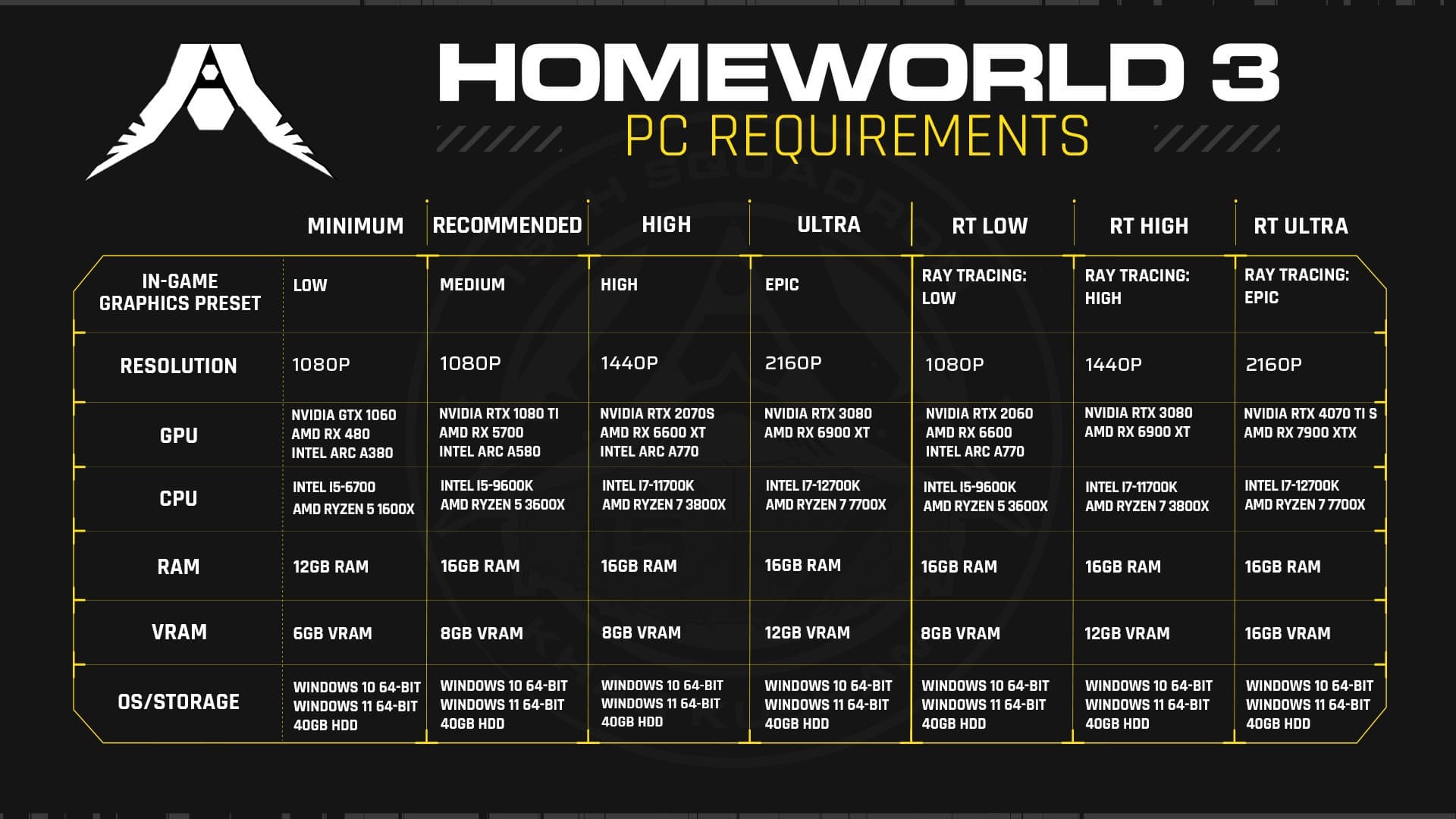 Похоже, Blackbird Interactive удалось оптимизировать код Homeworld 3 в преддверии релиза 13 мая 2024 года, поскольку студия снизила системные требования к ПК-версии будущей научно-фантастической игры. Текущие технические требования выглядят следующим образом: