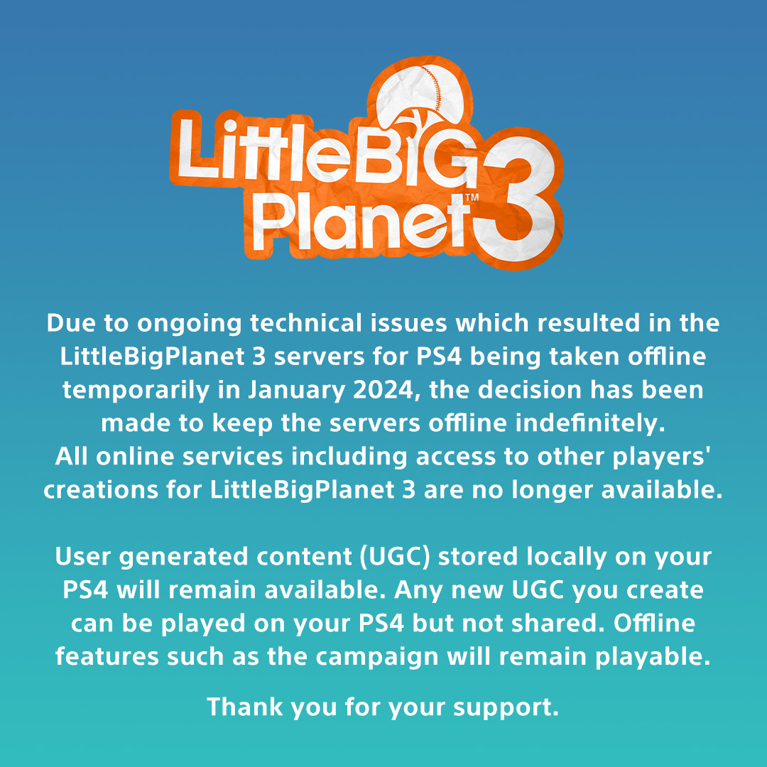 В результате студия Sumo Digital и Sony PlayStation приняли решение (похоже) окончательно отключить серверы LittleBigPlanet 3. Не успевшие сохранить пользовательский контент у себя на консолях утратили к нему доступ. Офлайн-функции игры, вроде сюжетной кампании, проложат работать и дальше: