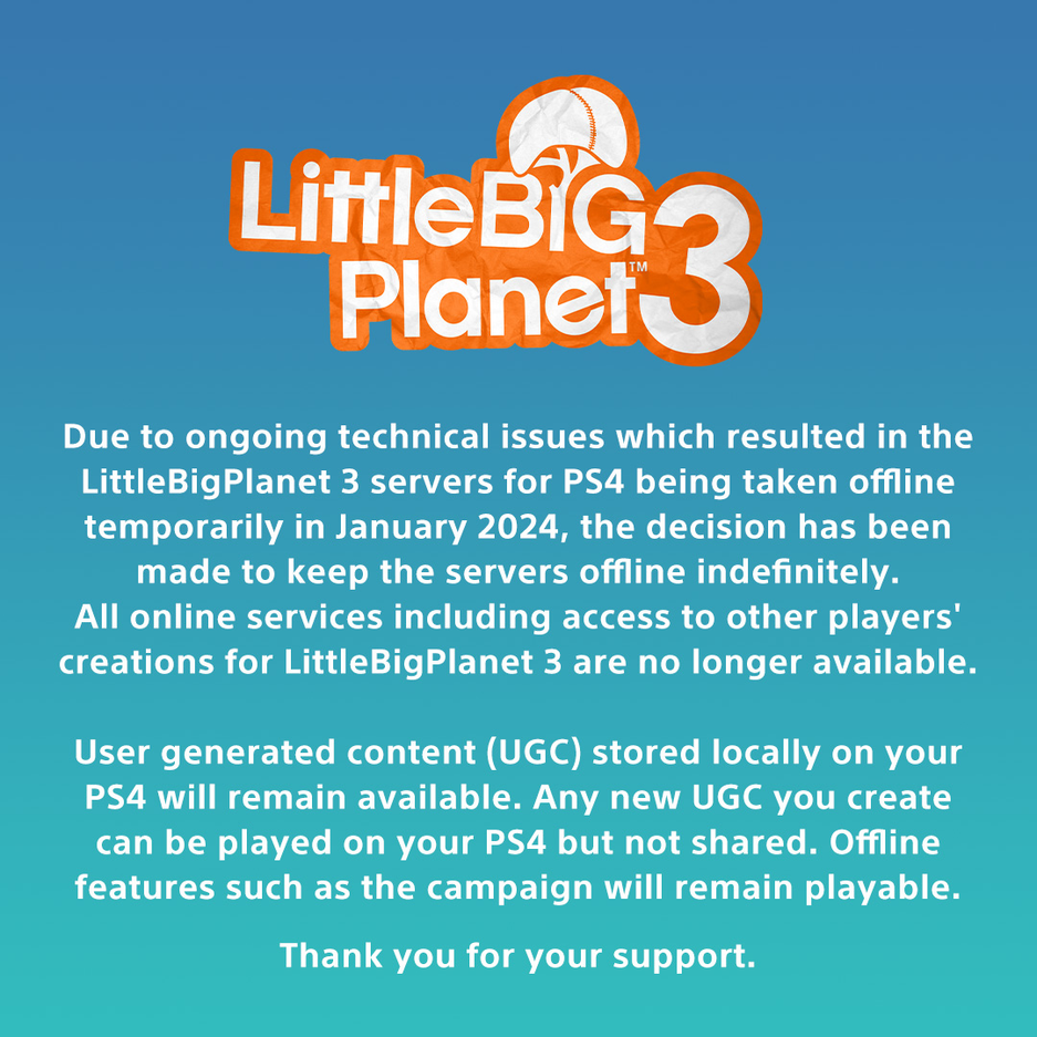 «Из-за продолжающихся технических проблем, которые привели к временному отключению серверов LittleBigPlanet 3 для PS4 в январе 2024 года, было принято решение оставить серверы выключенными.