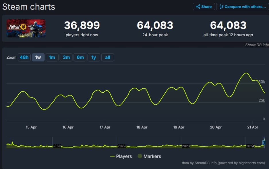 В начале недели мы писали о том, что Fallout 76 достигла нового исторического пика в 39,5 тысяч игроков, что в 2 раза больше предыдущего рекорда.