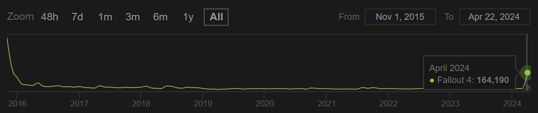 Судя по данным steamcharts, последний раз онлайн Fallout 4 в Steam превышал отметку в 100 тысяч игроков лишь в январе 2016 года. Однако в апреле 2024 года состоялась премьера сериала от Amazon и интерес к играм серии взлетел.