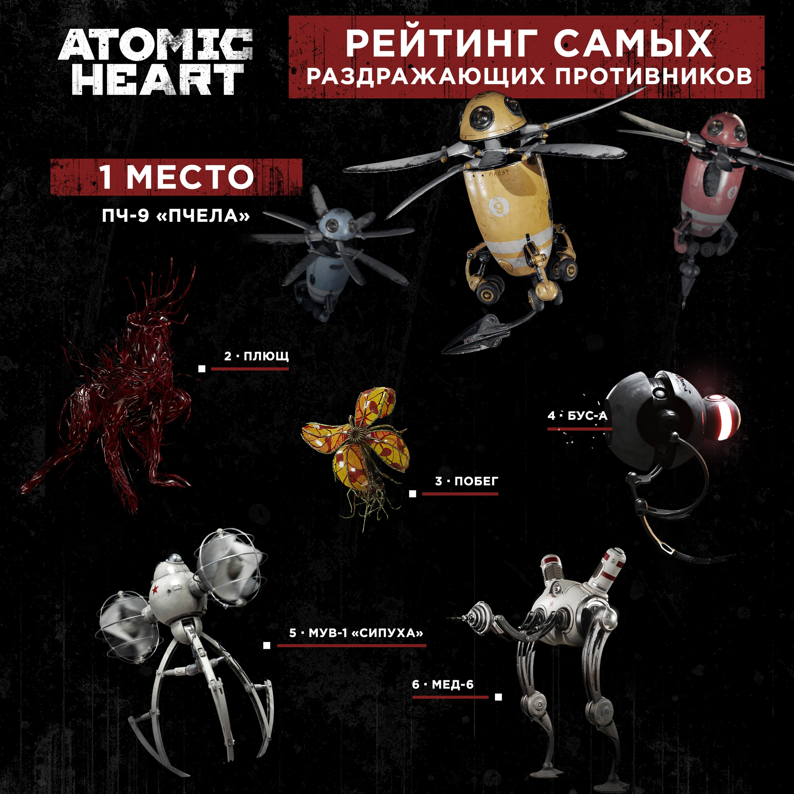 Лидер рейтинга для значительной части фанатов Atomic Heart был вполне предсказуем — это вездесущие роботы-пчёлы, несущие ответственность за доставку грузов и восстановительные работы на большинстве наземных и стационарных роботов, у многих вызывают раздражение.