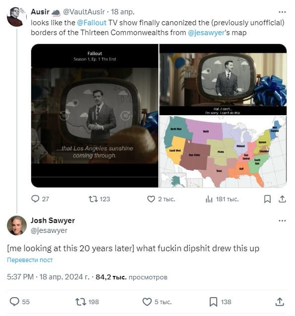В одном из эпизодов телесериала Fallout показана карта Соединенных Штатов, канонизированная в Fallout: New Vegas.