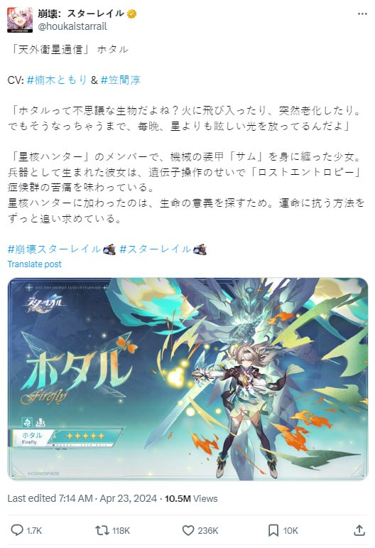 «Анонс Светлячка в японском Твиттере собрал 236 000 лайков и 10 млн просмотров за 12 часов. За всю историю анонсов этот пост оказался самым популярным и даже обогнал анонс Ахерон, который собрал всего 120 000 лайков».