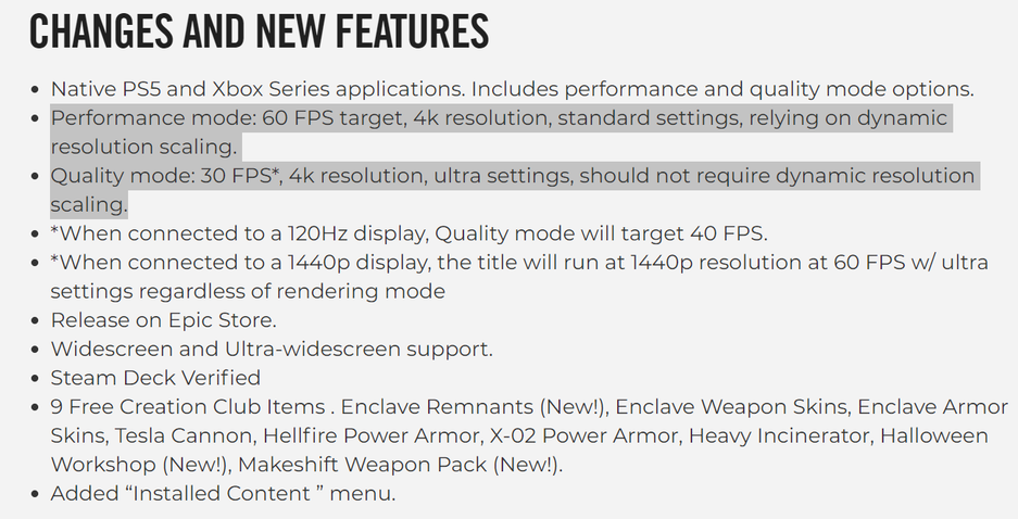 «Небольшая заметка о некстген обновлении Fallout 4 для Xbox Series X. Оно нацелено на 4К 60FPS во всех режимах. Режим Performance Mode [Производительности] более агрессивен в снижении настроек для достижения этой цели. Надеемся, это прояснит любую путаницу».