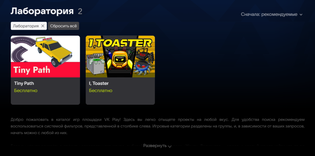 В магазине VK Play появился раздел «Лаборатория», который будет регулярно пополняться играми, разработанными студентами и участниками различных образовательных программ VK Education. Теперь разработчикам станет проще поддерживать обратную связь с игровым сообществом, получая отзывы, комментарии и конструктивную критику.